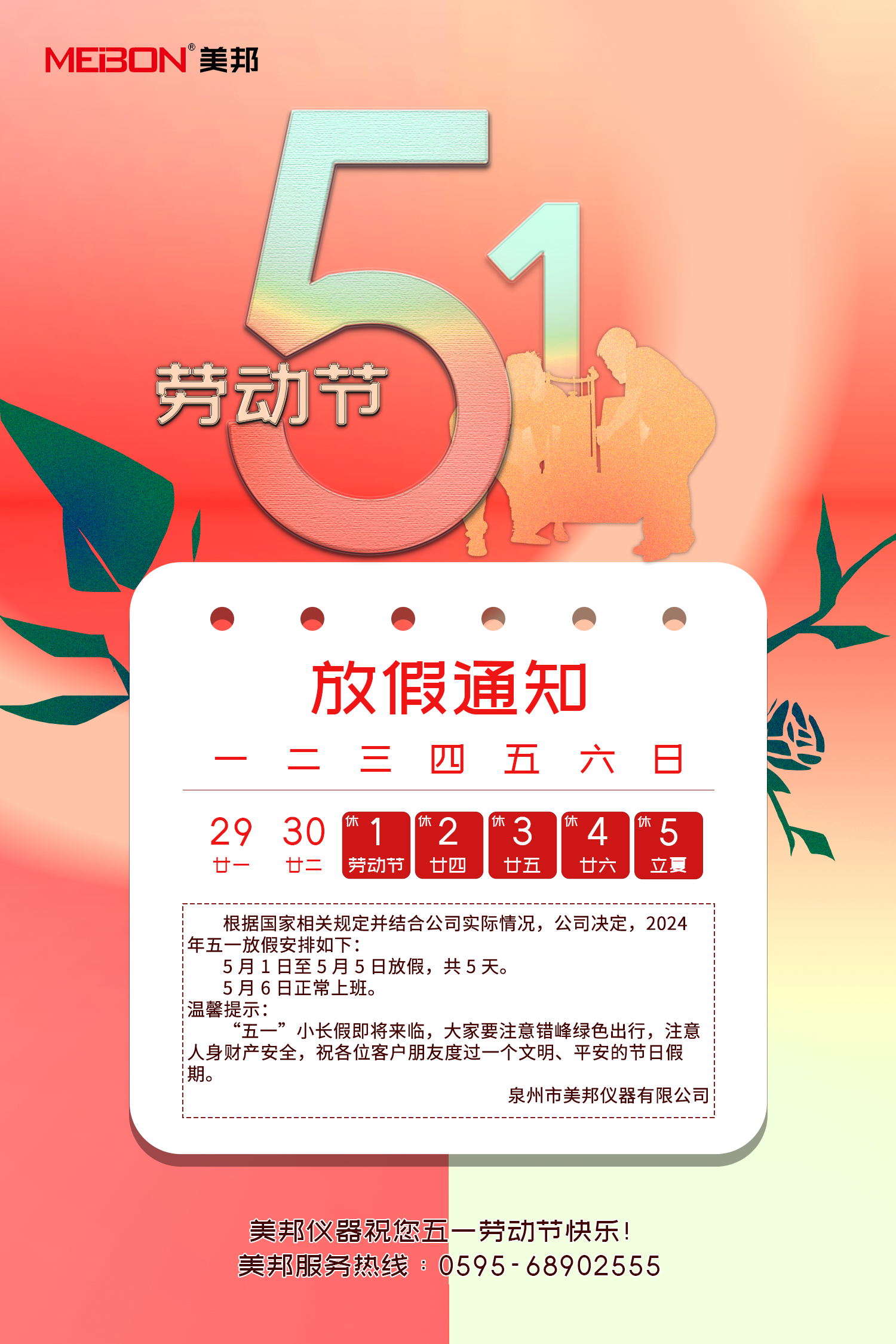 “五一”小長假即將來臨,大家要注意錯(cuò)峰綠色出行,注意人身財(cái)產(chǎn)安全,祝各位客戶朋友度過一個(gè)文明、平安的節(jié)日假期。